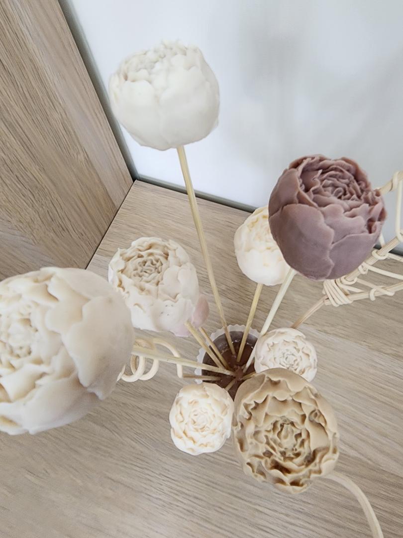 Composition de 9 pivoines avec du savon aux laits de chèvre.