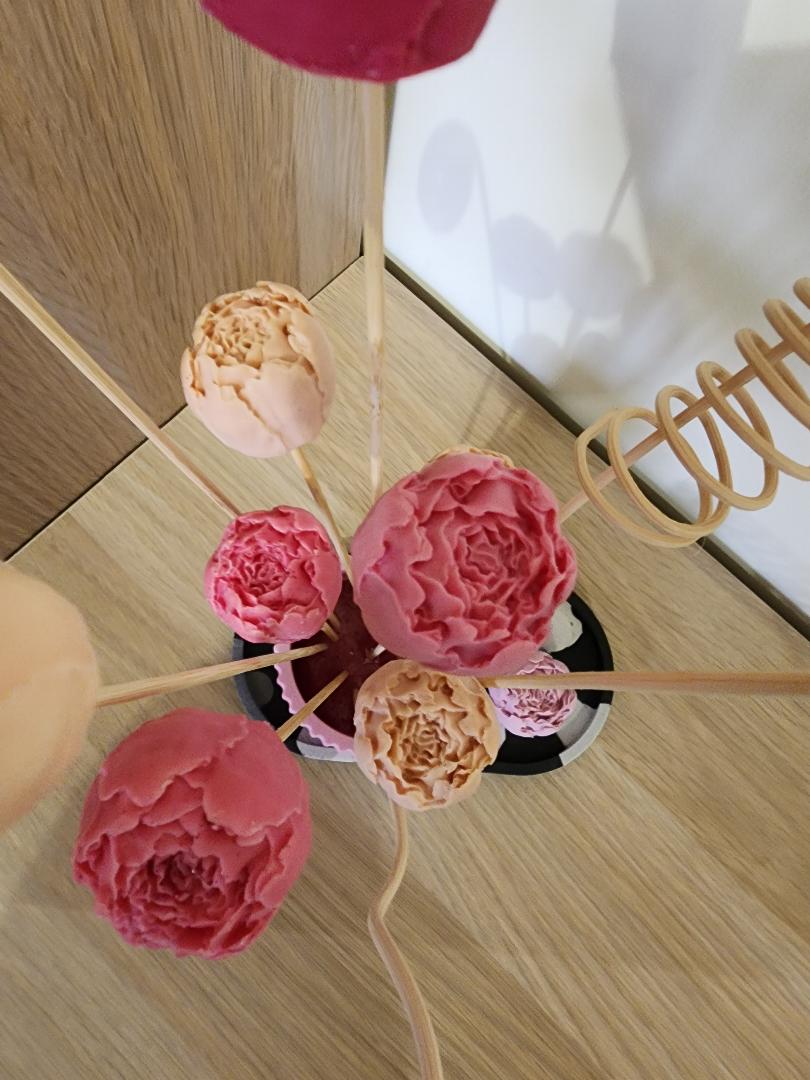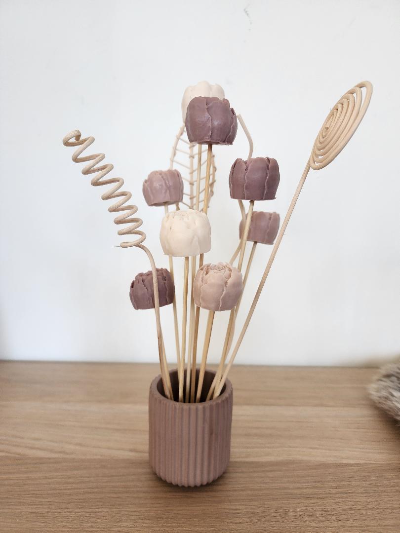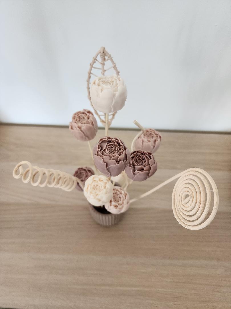 Composition de 9 pivoines de savons aux laits de chèvre dans un pot en Jesmonite et 3 bâtons en bois décoratif divers.